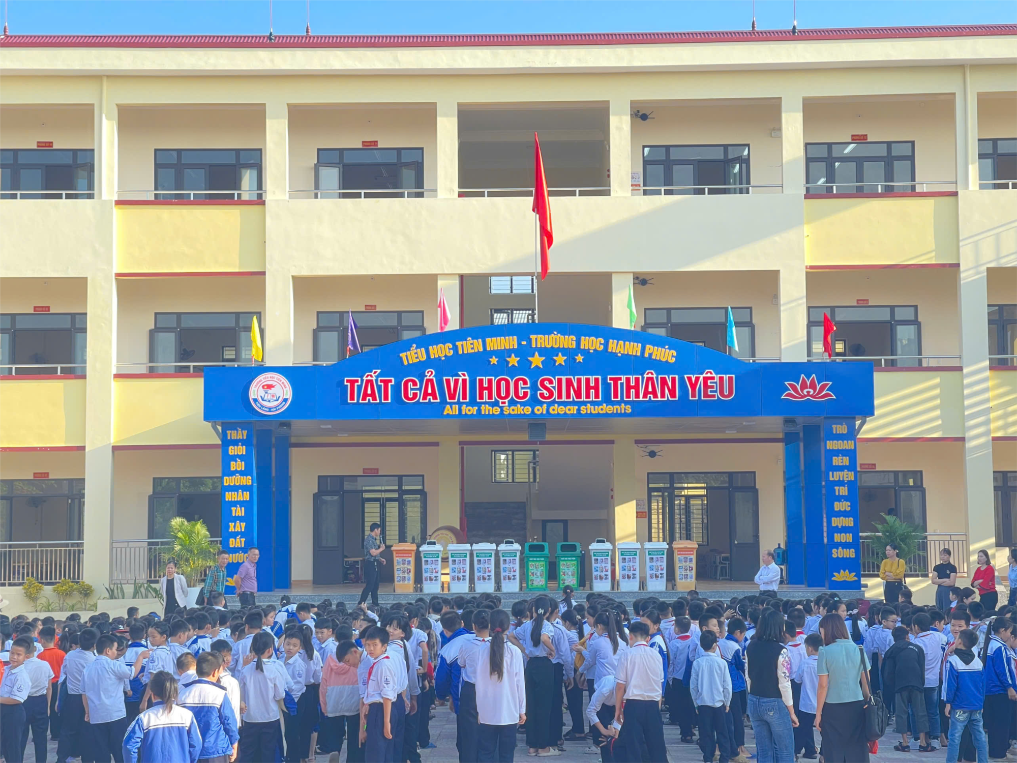 Bên cạnh đó, nhà trường luôn đồng hành cùng các em trong hành trình lan tỏa ý thức bảo vệ môi trường. Các thầy cô tích cực phối hợp với chính quyền địa phương, các tổ chức đoàn thể để triển khai các hoạt động tuyên truyền, vận động người dân tham gia phân loại rác. Hình ảnh các thầy cô giáo và các em học sinh mỗi tháng đều cùng tham gia hoạt động "Ngày chủ nhật xanh" kết hợp với các đợt ra quân của Đoàn thanh niên xã Tiên Minh, dọn dẹp vệ sinh môi trường, đã trở thành một hình ảnh đẹp, truyền cảm hứng cho cộng đồng. Qua đó, cộng đồng dần thay đổi nhận thức, chuyển từ việc thờ ơ với rác thải sang việc chủ động phân loại và thu gom rác thải đúng cách.