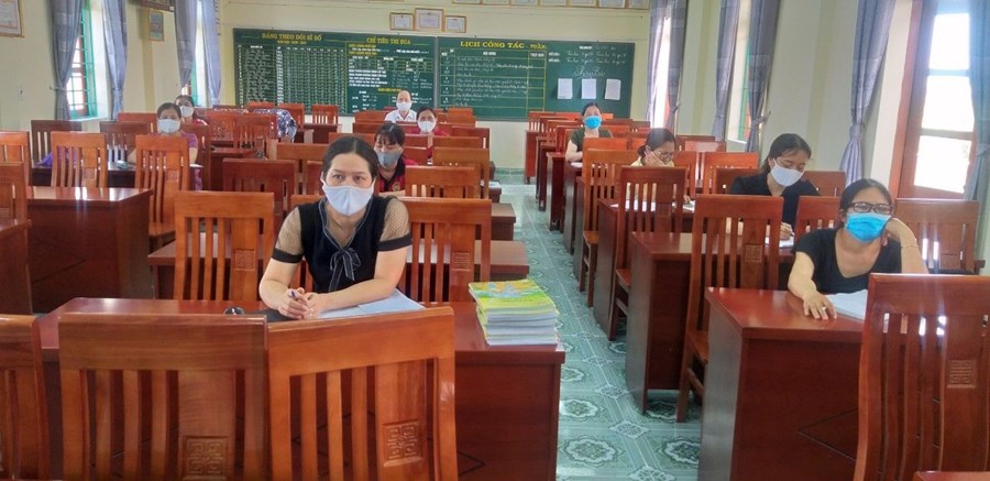 Giáo viên Trường Tiểu học Tiên Minh (huyện Tiên Lãng, Hải Phòng) tập huấn học trực tuyến SGK mới trong mùa dịch COVID-19.